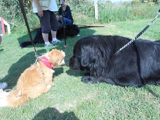Rencontre d'un Lhassa Apso et d'un terre neuve.